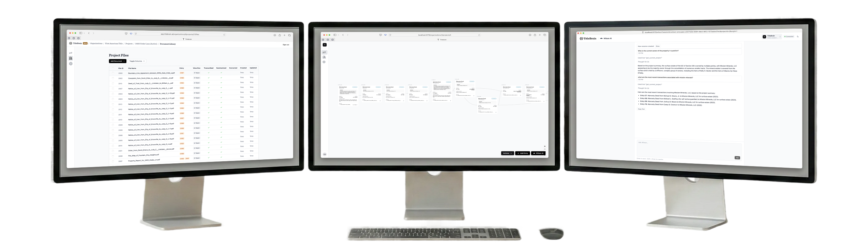 TitleBrain is designed for multi-screen setups. Spread documents, chain analysis, and AI assistance across your displays for the most efficient title examination workflow.